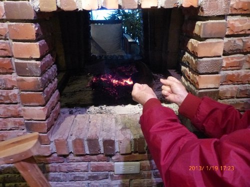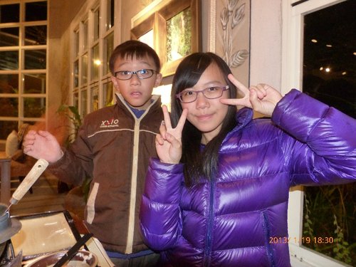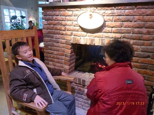 餐廳中間有一個壁爐,瞧!弟弟真是舒服的樣子。