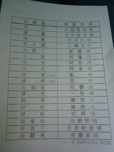 介紹完人蔘後,發下自己編寫的講義,韓文教學,[安妞哈誰唷]是你好,不錯喔!真好用。其實韓語的那些符號是韓文的注音符號,只要把注音符號學會了,韓文就都會念了。韓國以前也是都使用漢字,和我們一樣,只是唸法不同,就好像中國的方言一樣,因為漢字複雜難懂難學,所以就發明了韓文,讓大家好學好用。