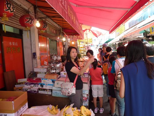 小江帶我們去買水果,胖阿姨水果店,導遊說他會講多國語言喔!當然中文也通喔!