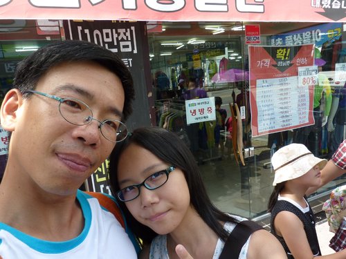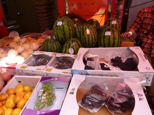 西瓜一顆5萬韓幣,大約台幣1500元,真是貴,不知是西瓜少,還是物價高。我們買了一顆水梨韓幣5000元,三串葡萄韓幣5000元。