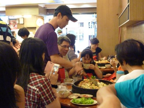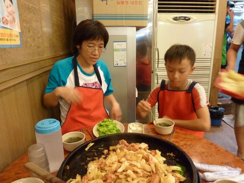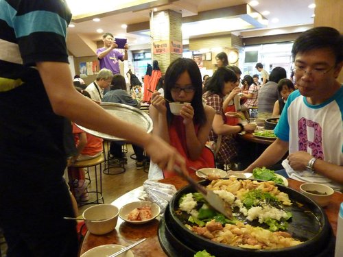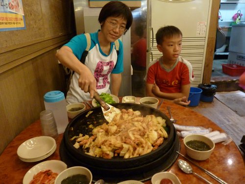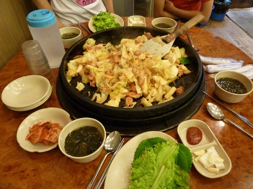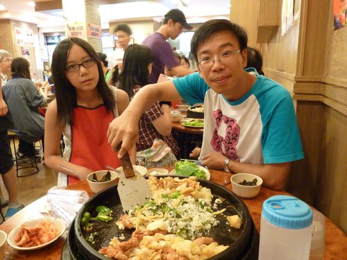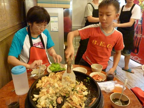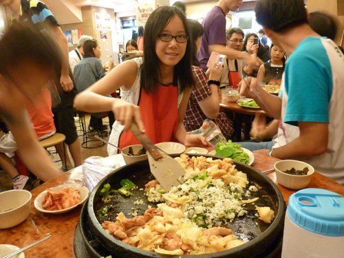 好大一個炒盤,四人一桌。高麗菜、雞肉還有韓國年糕一起拌炒