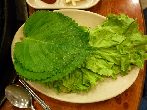 將炒好的料包生菜一起吃,左邊的是紫蘇葉。