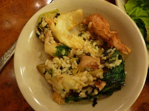 吃到一半,服務人員把飯加入,一起拌炒,變成炒飯。