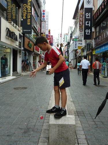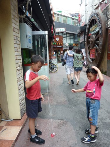 吃飽喝足,弟弟在門口玩起溜溜球。
