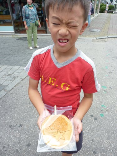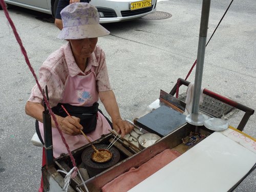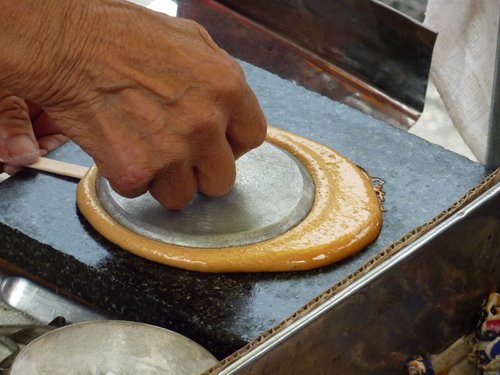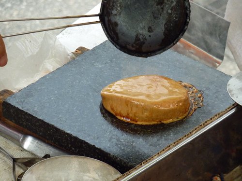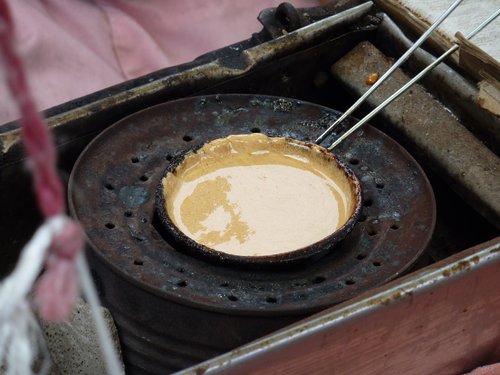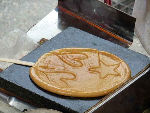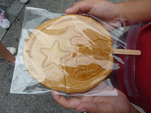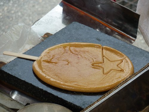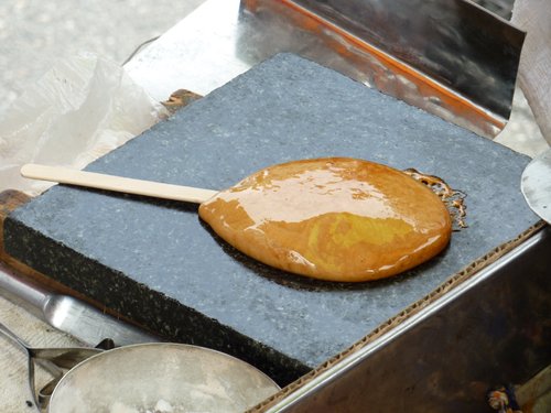路旁有位老婆婆在賣棒棒糖,很特別。把砂糖放入加熱融化