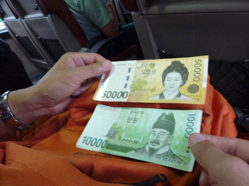 韓國的紙鈔,5萬元和1萬元,今天的目的地,上午是室內滑雪和水世界,下午到晚上是在樂天世界,所以午餐和晚餐自理,但是旅行社會發現金,每人每餐8000韓圜,所以我們家總共領了8萬元。