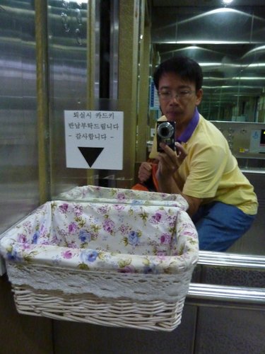 上面還有寫韓文字,好奇心的驅使之下,小江導遊說,因為韓國的飯店服務的人員很少,太早可能還沒來上班,如果你急著退房,可以把房卡鑰匙放在這裡即可。導遊說韓國人都很純樸善良,也都互相信任。所以不會有問題。如果在台灣就不知道行不行得通喔!