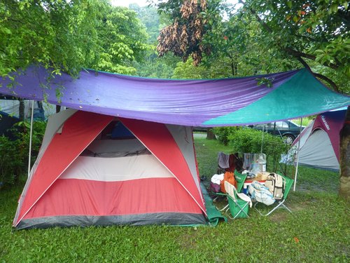 這是振平伯伯的帳篷,還好他也有準備天幕帳,不然帳篷肯定會進水。第一次全家露營就碰到下大雨,真是......,不過這樣才知道自己還欠缺什麼。