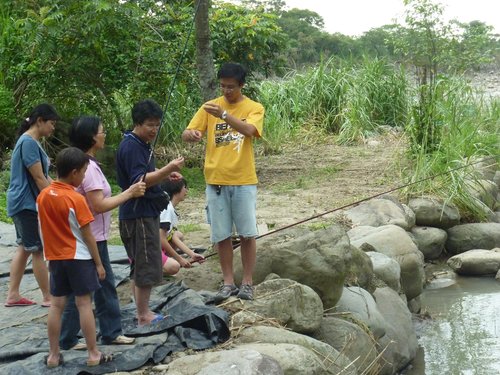 搭完帳篷,大家決定去旁邊的小溪釣魚。振平伯伯先教弟弟如何上魚餌。