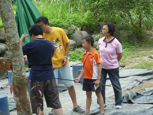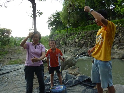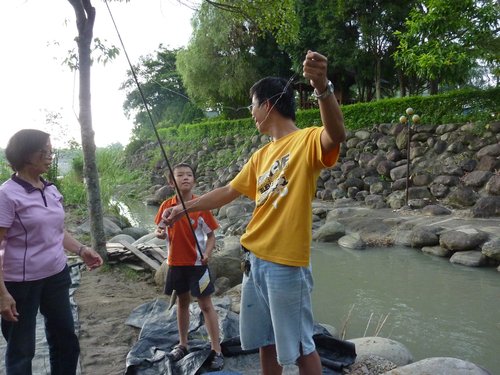 換個地方釣釣看,釣到一半,下起午後大雷雨,趕緊把帳篷移到天幕下,還好只是一小陣,在我們回去移帳篷的空檔,弟弟沒有魚餌,想說釣釣看,沒想到不知道是魚沒長眼睛,還是餓昏了,竟然沒魚餌也讓弟弟釣到。