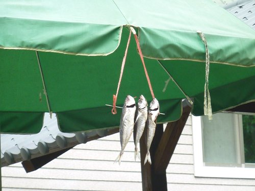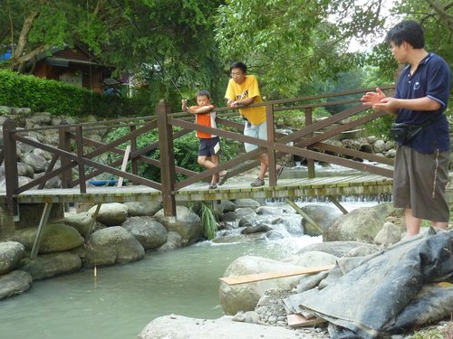 最後大約到3-4條魚,都沒有很大隻,全部放回小溪了,這三隻不是我們釣的。隔壁一家再烤肉的人吊的,不知道是買的還是溪裡釣的。