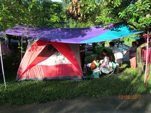 2012/08/11星期六,天氣晴,這一次是和晴天露營社的夥伴一起到新竹溫馨庭園露營,一共有五頂帳篷,我們等姐姐上玩鋼琴課,下午一點才出發,與振平伯伯會合後一起出發,振平伯伯拿了一支無線電,沿途邊開邊聊天。大約一個小時左右,我們抵達營區,天氣已轉為陰天。