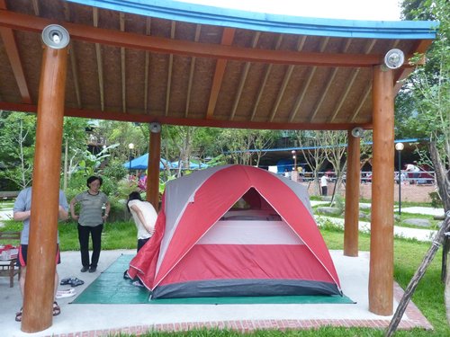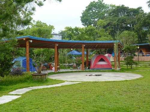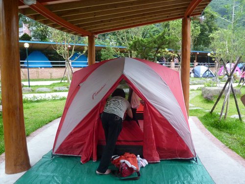 這一次的露營活動是由媽咪教會主辦的,我們星期六當天中午為了配合姐姐學校的同學聚餐,所以一直到下午三點才出發,大約一個多小時的車程,到了營地天氣還不錯,不過最近天氣不太穩定,所以我們事先訂了一個有屋頂的營位,先把帳篷搭起來再說。