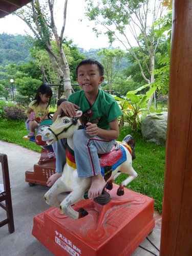 這位已經不小的小朋友,還想玩電動馬車。坐坐就好。