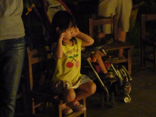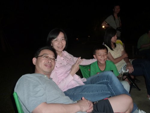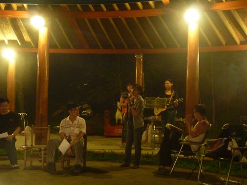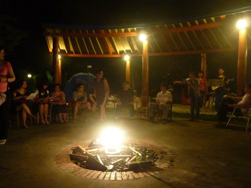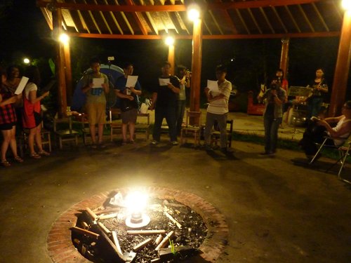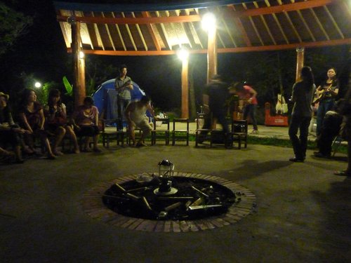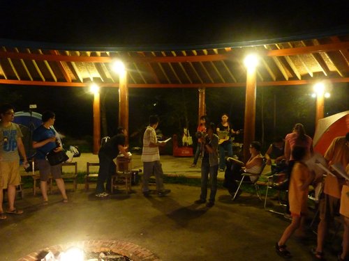 在烤肉的過程中下了一場大雨,還好有屋簷,全部移到屋簷下繼續烤。烤完肉之後就是精采的營火晚會。大家圍繞著營火場地而坐,準備開始晚會。