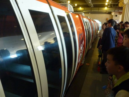 q月台上人很多,大家聽從服務人員的指示搭乘。