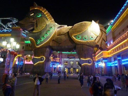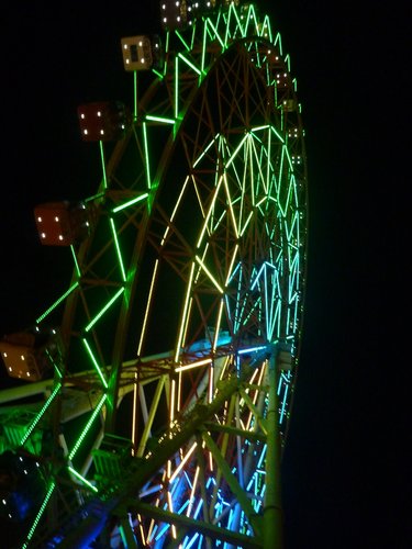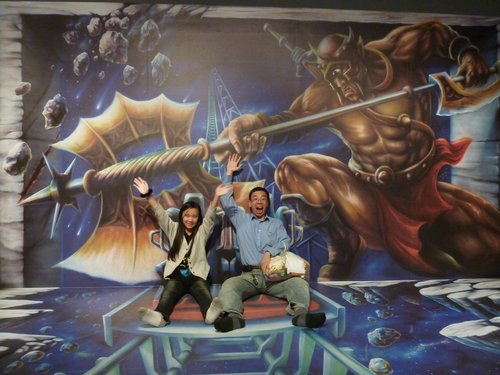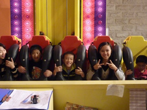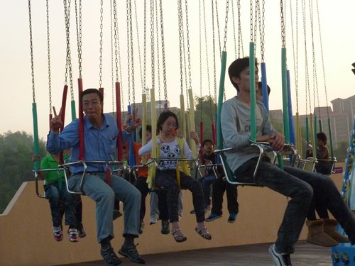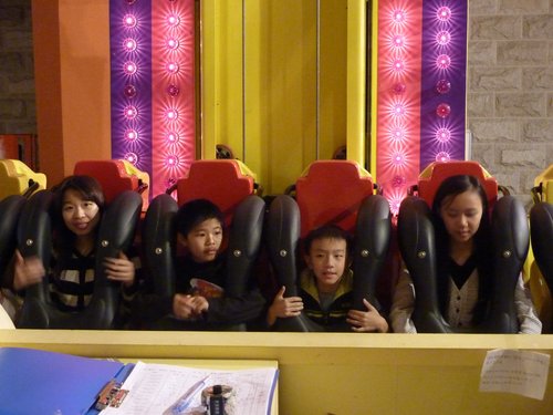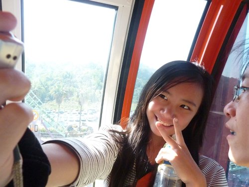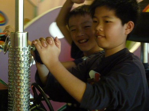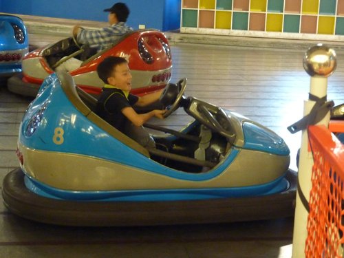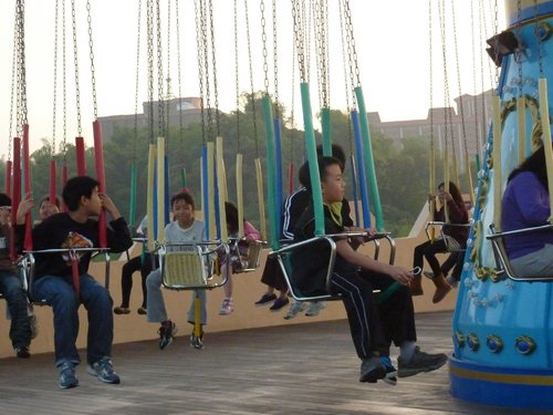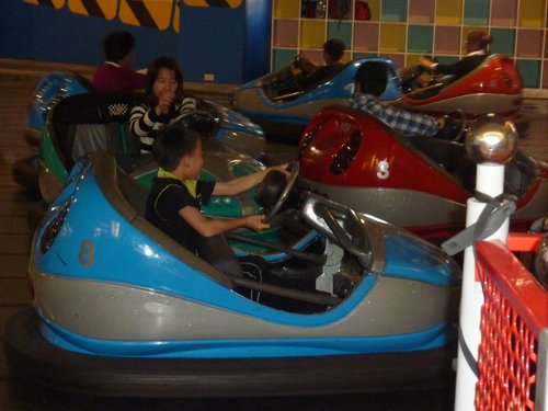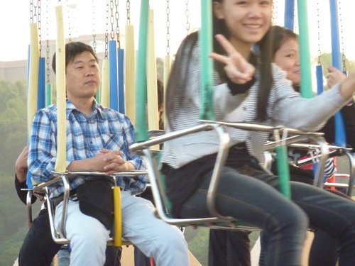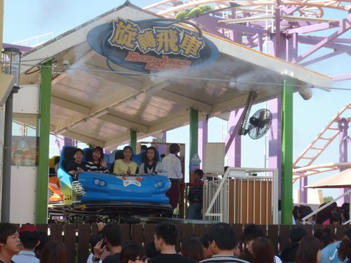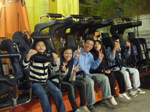 q園區的景色,天氣真好。好熱喔!後面這個U型的遊樂設施,相當恐怖,晚上時排隊人潮較少,小表弟吵著要去玩,沒人敢陪他玩,姑姑只好犧牲勉強陪他去玩,沒想到他竟然玩上癮了,還要再玩一次,姑姑不敢再玩了,沒人陪的他只好放棄了。