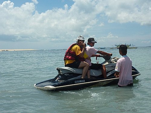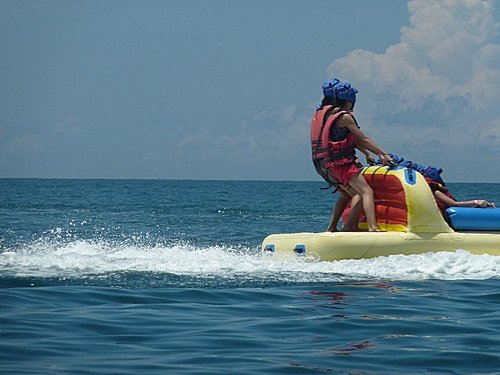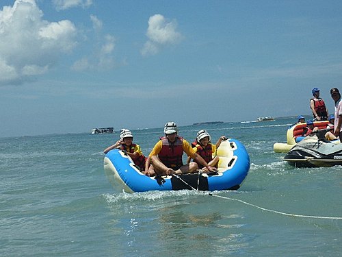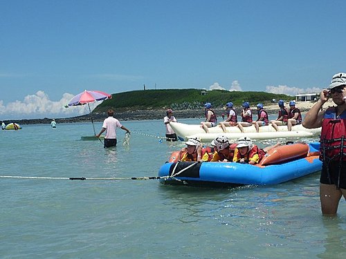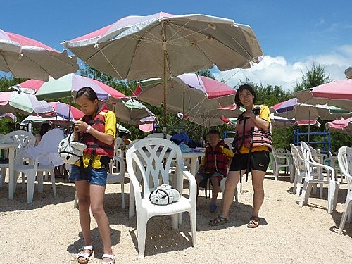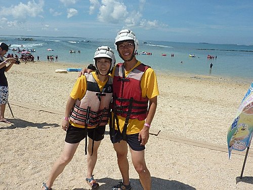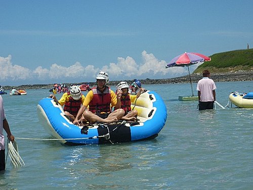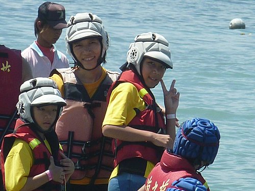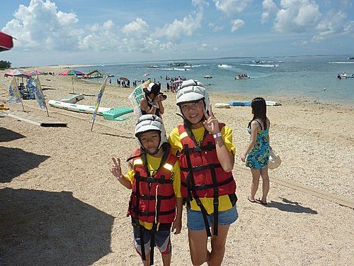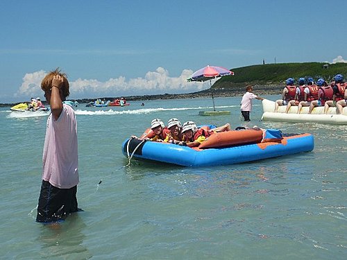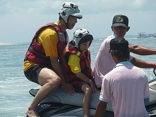下了船後,到了租機車的地方,拿了預定好的租車單,騎了大約5分鐘左右,到了今天要玩水上活動的地方,報到後,聽工作人員的解說後,穿上救生衣,開始今天的水上活動。工作人員說所有的水上活動依規定一律不准故意翻船,這讓有小朋友的我們來說,真是一個好消息啊!