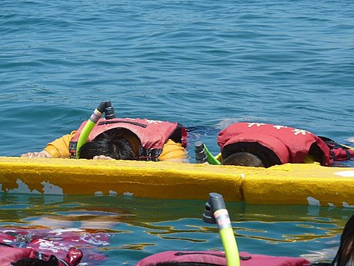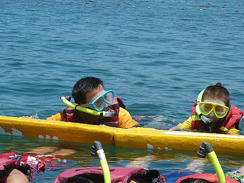 我們戴著蛙鏡與呼吸管,搭船到離岸邊較遠的地方,由水上摩托車拉著船慢慢前進,我們只要扶著船就可以欣賞海底的景色了!