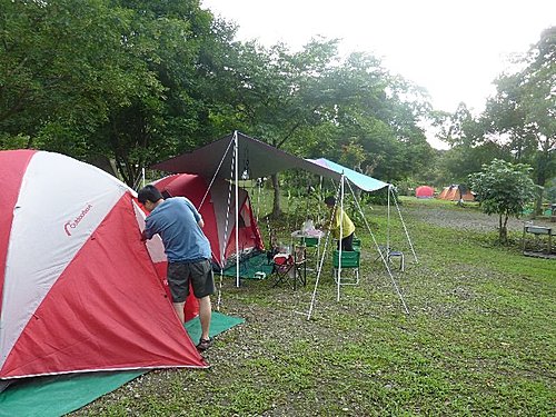 這才是第二天星期六的下午,後面就沒有照片了, 原因是傍晚時候下了一場大雨,雨勢還不小,一直沒有機會測試帳篷的防水程度,這下子可是機會來了,雨下得又急又大,一下子營地就淹水的,真是雨中作樂,還好只是陣雨,雨停之後趕緊查看帳蓬有無浸水,還好沒有,真是不幸中的大幸,真希望半夜不要再下雨了,被雨打亂了,大家只好早早就寢,畢竟大家也都累了!很幸運的整晚只有零星的小雨,並無下大雨,第三天星期天的早晨起床就見到了可愛的陽光,真是老天爺幫忙,趕緊將帳蓬晒乾,小朋友繼續玩水,大人整理整理曬好的帳篷,趁著午後雷陣雨還沒下之前,離開營區,前往大溪午餐,就在我們進入達摩小吃店準備用餐之際,下起了大雷雨,我們真是幸運,飽餐之後前往賴媽媽豆花,吃好久沒吃的豆花,無奈與還是下不停,只好繼續躲雨,剛好樓上的演藝廳正播放免費電影[2012],雖然大家有看過,反正躲雨,上去看看複習一下,看完之後雨勢稍小,趕緊前往停車的地點打道回府,結束了這一次的露營,回家的路上下起了超大的雷陣雨,路上都淹水了,好家在我們已經在車上了.