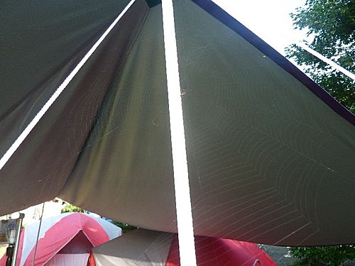 蜘蛛結網的速度真是快阿!一個晚上就已經在我的兩根營繩中間結網