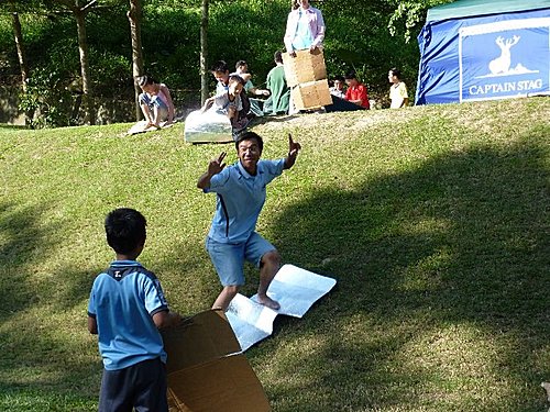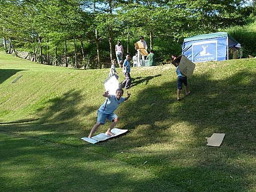 這裡有一個小型的滑草場,用紙箱就可以滑草,小朋友和大人都玩的不亦樂乎