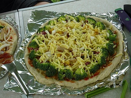 一連吃了5個披薩,大家都吃飽了,不過還有一個餅皮,留給阿宣和姐姐ㄧ人一半,各自發揮,做自己喜歡吃的口味,結果如下,最後還是全部吃完了,由於爸爸在家有事先練過,所以這次的午餐吃披薩很成功喔.