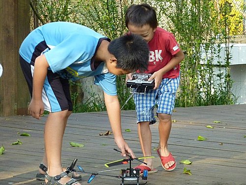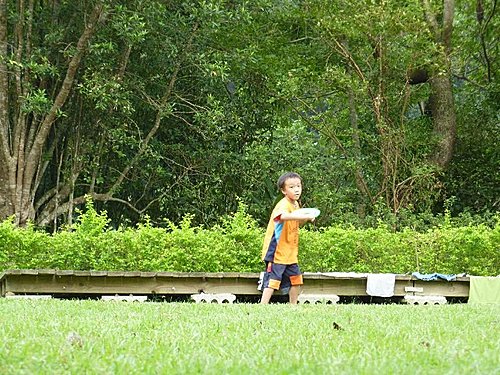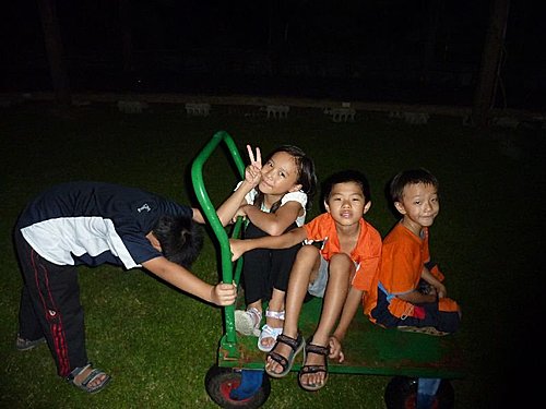 晚上四個小朋友在草皮玩老闆的推車(這是老闆貼心位客人準備的,用來搬東西用的,因為棧板區的草皮區車子不能開進去)