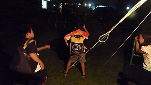七手八腳總算是把天幕帳搭好了,不過營繩的綁法有點不太會,參考別人的綁法總算是學會了.