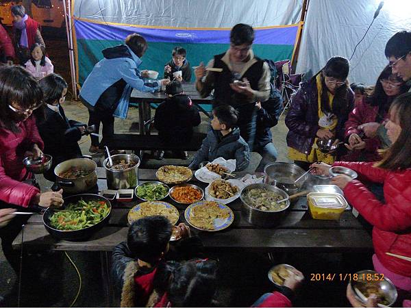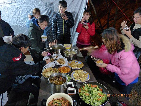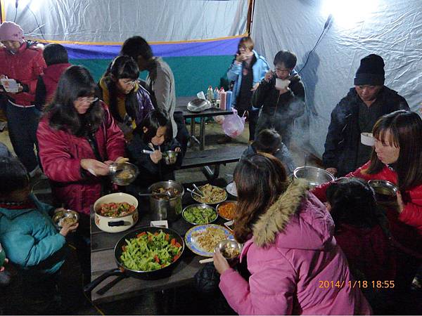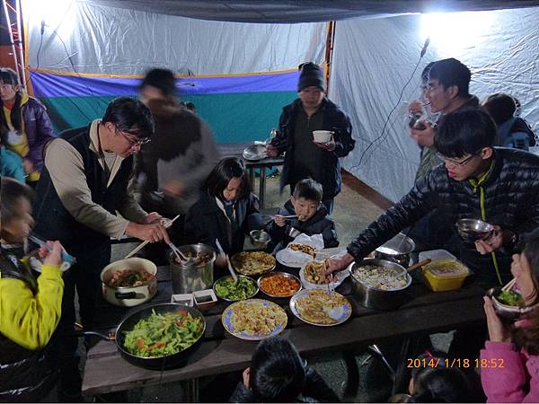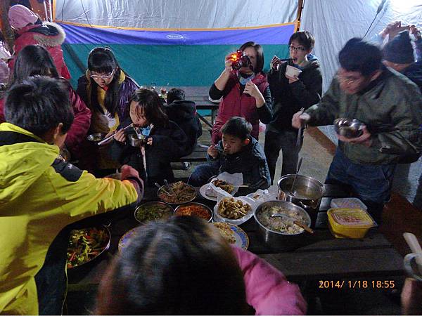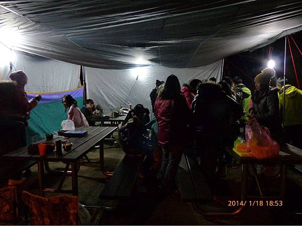 由於風很大,於是大家都把帳篷搭在客廳帳中,晚上是本社團的第一次共餐,只好集合三頂天幕,搭起來當作是用餐的場地。傍晚時風還是很大,費了很大的力氣才搭起這一個地方。