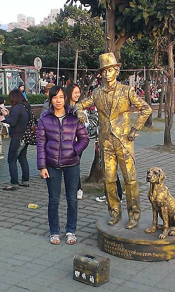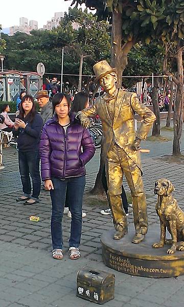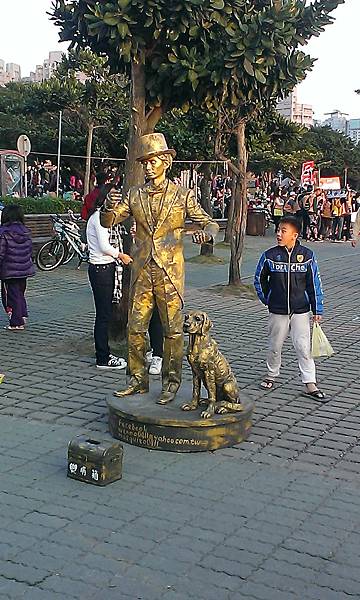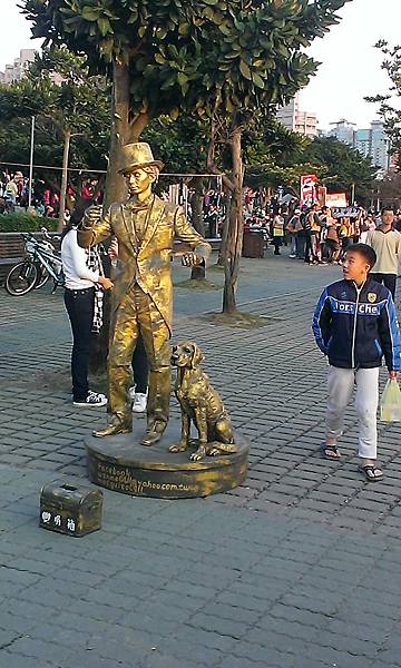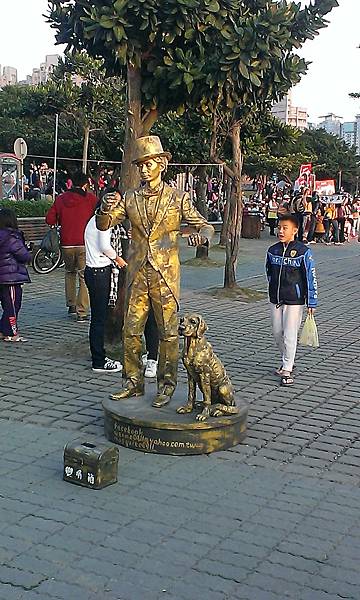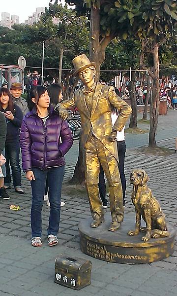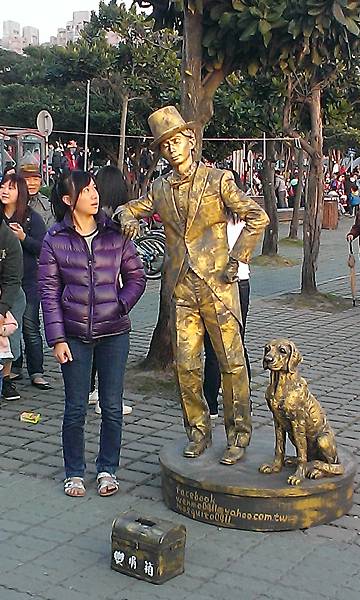像銅像一樣一動也不動,只要有人投錢,他就會動一動,配合照相。