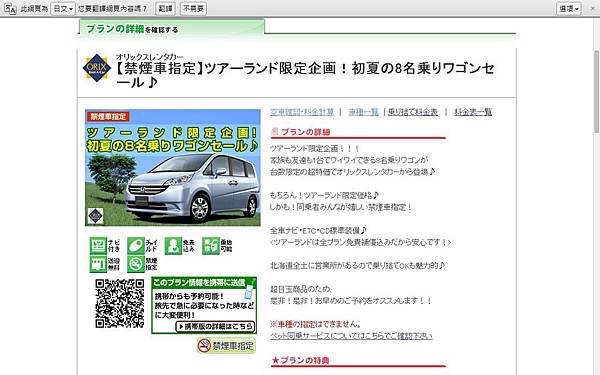 機票有了,接下來是租車,比較了好多家租車公司,一直無法決定,最後在北海道ツアーランド 看到優惠方案,於是3/18下手預約。十二天日幣90500円。 這ORIX租車WA等級的八人座車。這個網站預約租車不用先付訂金喔!不過既然訂了就一定要去,不然就一定要依規定取消喔!不要當個失格的旅人喔!對了,日本租車,別忘了到監理站去辦駕照日文翻譯本喔!除了翻譯本,台灣的駕照也要帶喔!