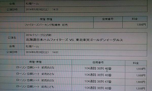 5/4上網購買6/28星期六在札幌巨蛋的日本職棒比賽門票和停車券,陽岱鋼指定席。上網買票的教學可以參考悶騷的部落格日職北海道火腿隊比賽門票購票方法