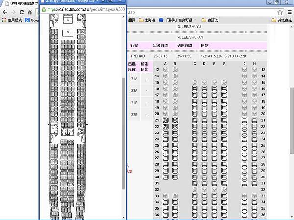 6/5上網選出發飛機的座位如下:21A、21B、22A、22B