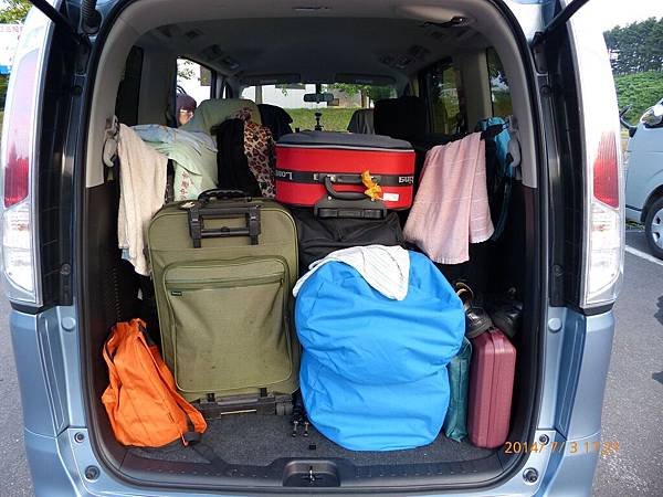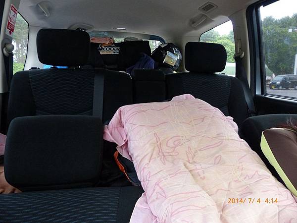挪出空間,把駕駛座和副駕駛座的窗戶裝上紗網,前方擋風玻璃用檔太陽的紗網擋住,就這樣展開了今晚的車中泊,弟弟睡第三排,姊姊睡第二排,爸媽將第一排座椅倒下睡。