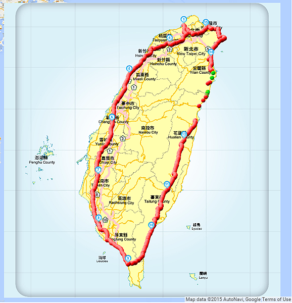 環島軌跡圖,那一段不連續的是蘇花公路,我們搭火車取代。