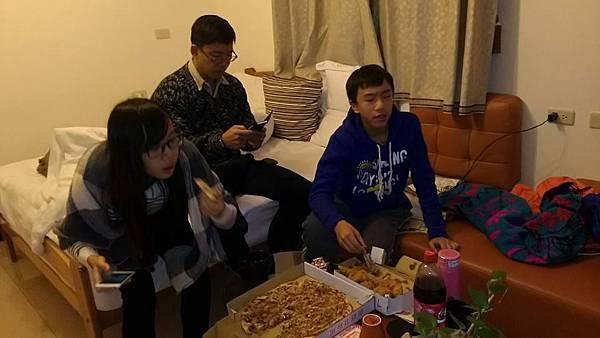 晚餐時間,雨還在下,今天是媽咪生日,應該外出吃大餐慶祝一下,無奈又冷又雨,想了一下,上網查看有沒有披薩外送,竟然有可以外送,太好了,披薩大餐就是今晚的晚餐,吃完晚餐把拔和媽咪騎車前往附近的全聯買零食和小蛋糕,慶祝一下,這種天氣還是躲在民宿裡比較溫暖。