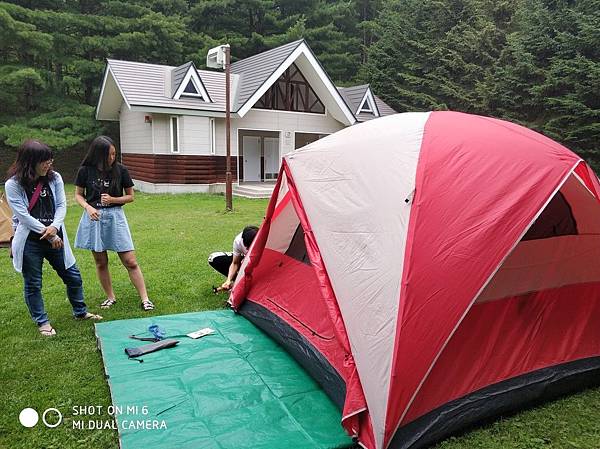 地墊怎麼跑到屋頂上去了,當天晚上下起了大雨,我們的帳篷禁不起大雨,漏水了,雖然在台灣有買膠條,重新將舊帳棚更換新膠條,無奈還是漏水,還好我們有備案,睡前將地墊變屋頂,才能安穩的睡一晚。