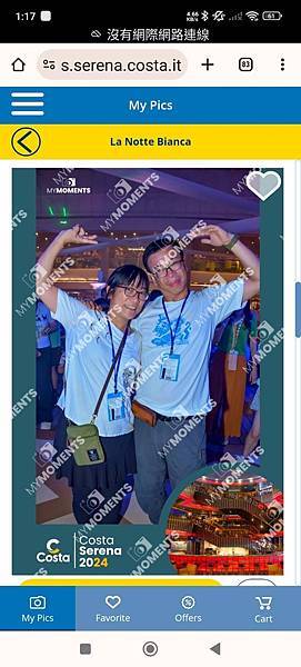 >→上船吃我們遲來的午餐(吃完已5:45,大概還有2小時又要到我們的晚餐時間),晚餐又去主餐廳~嗯~覓食,只點了主餐與點心,完食後在快出餐廳時發現活動要開始了,四人就又坐回位置 Hi 了幾分鐘,其間還跟服務人員帶著跳了一段舞→劇場看完表演,參加白色 part,high翻一 整晚。